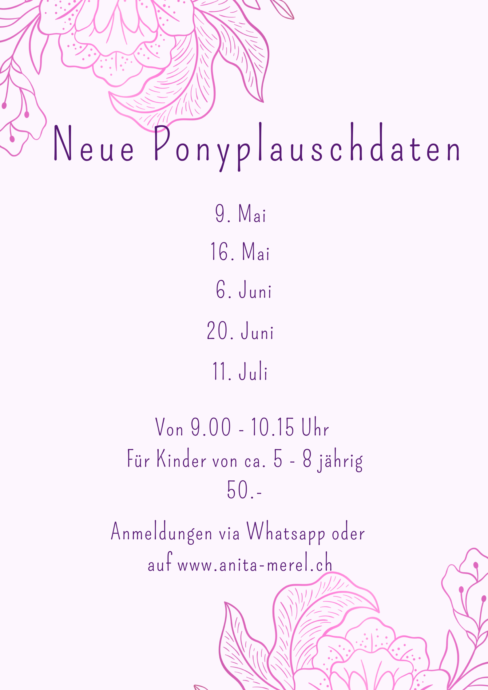 Bitte prüfe vor der Teilnahme / Anmeldung die allgemeinen Geschäftsbedingungen. Mit der Anmeldung zum Ferienkurs oder Ponyplausch / pferdegestütztes Coaching akzeptierst du diese. Mit der Teilnahme am Ponyplausch / Ferienkurs / pferdegestütztem Coaching gelten die AGB als akzeptiert.